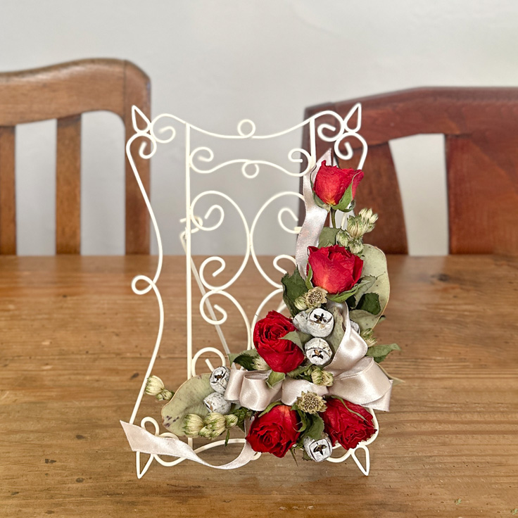 このクラスでご提案したいのは、お花と一緒に「自分の大好きなもの」を愛でる時間。 ワイヤーが描くフレームの余白に、お気に入りの一枚をさらりと添えてみてください。