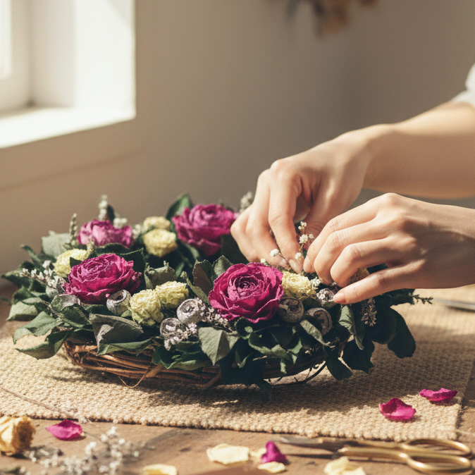 本や動画だけでは得られない「スムーズな制作のコツ」や、「失敗を美しさに変えるリカバリー術」まで余すことなく伝授します。 自己流を卒業し、どんな花材も自信を持って扱える「一生モノの土台」を築くクラスです。