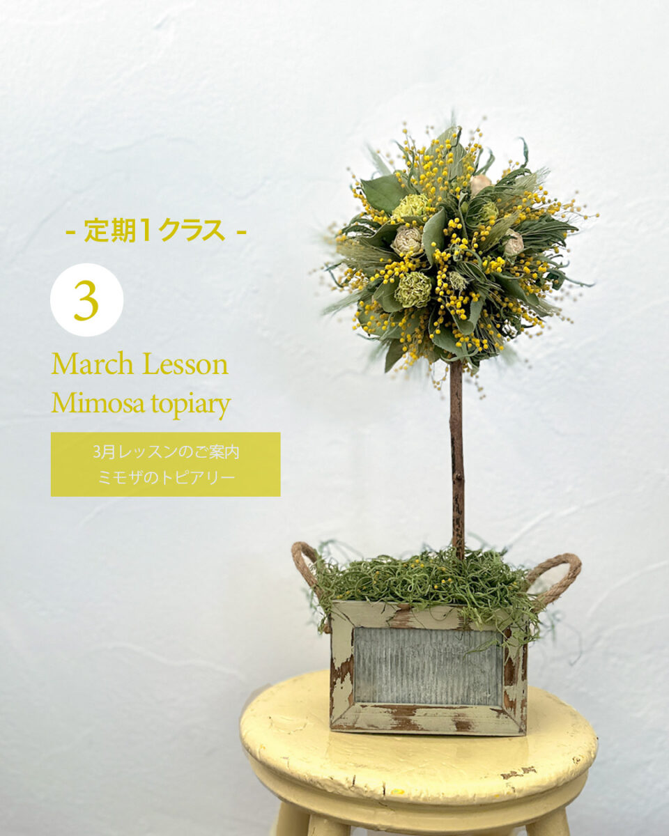 春の光を凝縮したような、愛らしいフォルム。 3月のベーシッククラスでは、存在感のある「トピアリー」をお仕立てします。