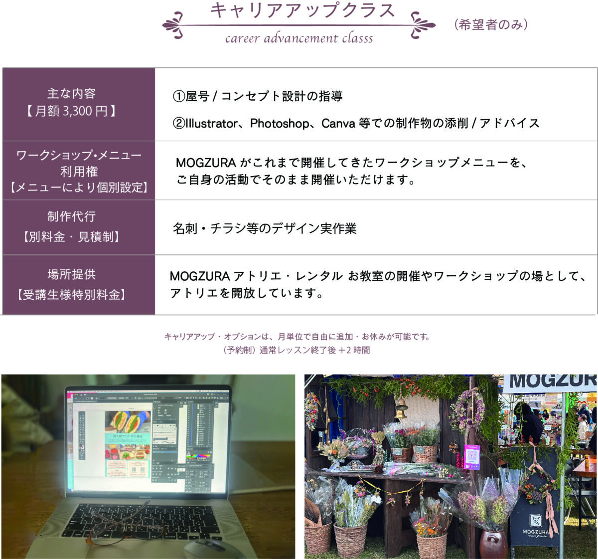 ① 資材・ 資材・花材の持ち込み自由 ② 花材の特別価格販売 ③ 作品添削 ④ 教室レンタル(優待料金) ⑤ イベント・活動支援サポート |